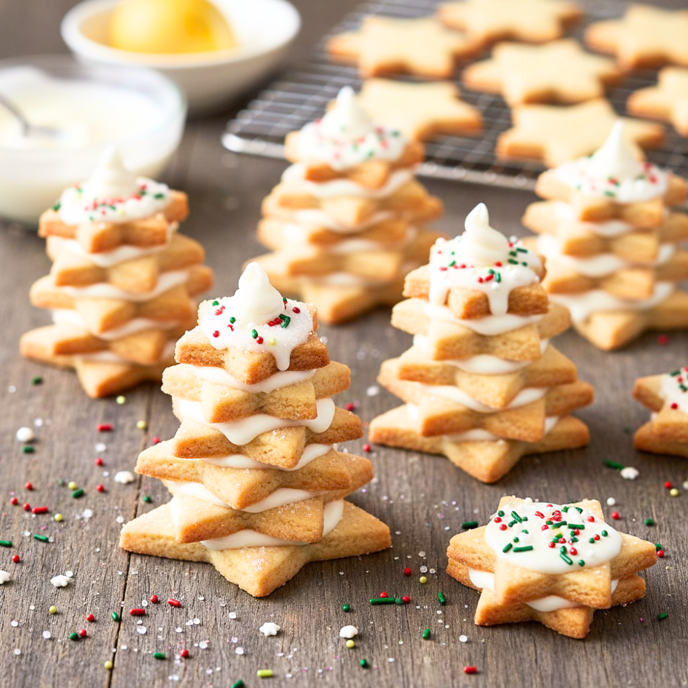 - 作業台に小麦粉をまぶす。生地を麺棒で伸ばし、クッキーカッターで様々な大きさの星型に切り抜き、クリスマスツリーを作る。クリスマスツリーを作るには、大きな星が2つ、中くらいの星が2つ、小さな星が2つ必要。
