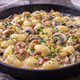 - ใส่เกี๊ยวที่ต้มแล้วลงในกระทะ โรยต้นหอมและแฮมลงไป เสิร์ฟได้ทันที.